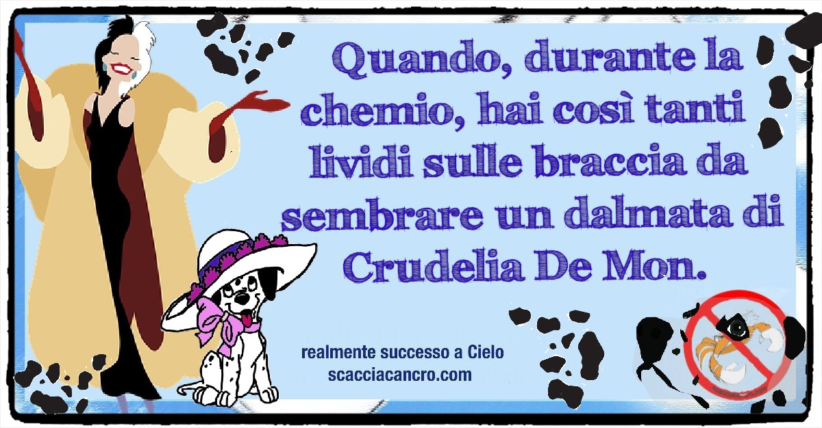 Quando, durante la chemio, hai così tanti lividi sulle braccia da sembrare un dalmata di Crudelia De Mon.