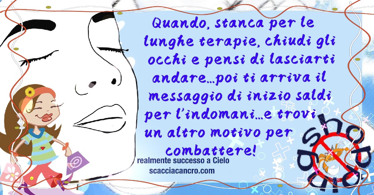 Quando, stanca per le lunghe terapie, chiudi gli occhi e pensi di lasciarti andare…poi ti arriva il messaggio di inizio saldi per l’indomani…e trovi un altro motivo per combattere!
