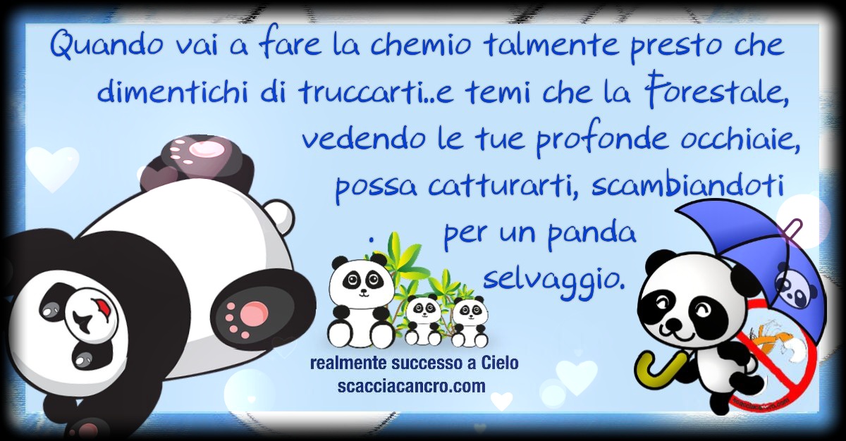 Quando vai a fare la chemio talmente presto che dimentichi di truccarti..e temi che la Forestale, vedendo le tue profonde occhiaie, possa catturarti, scambiandoti per un panda selvaggio.