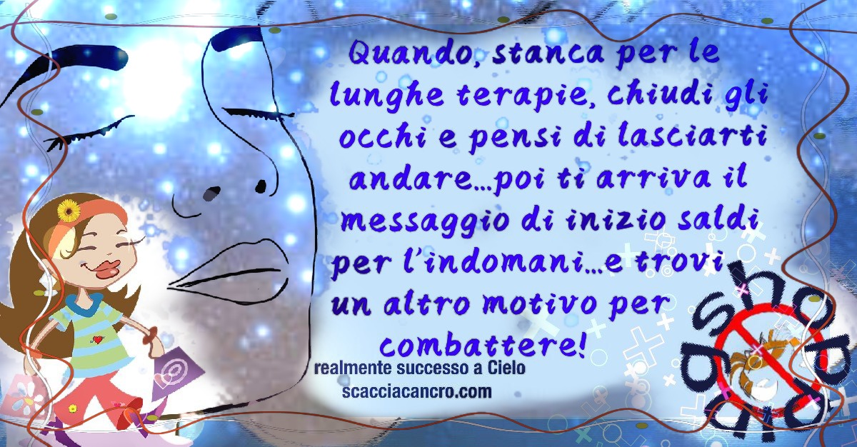 Quando, stanca per le lunghe terapie, chiudi gli occhi e pensi di lasciarti andare…poi ti arriva il messaggio di inizio saldi per l’indomani…e trovi un altro motivo per combattere!
