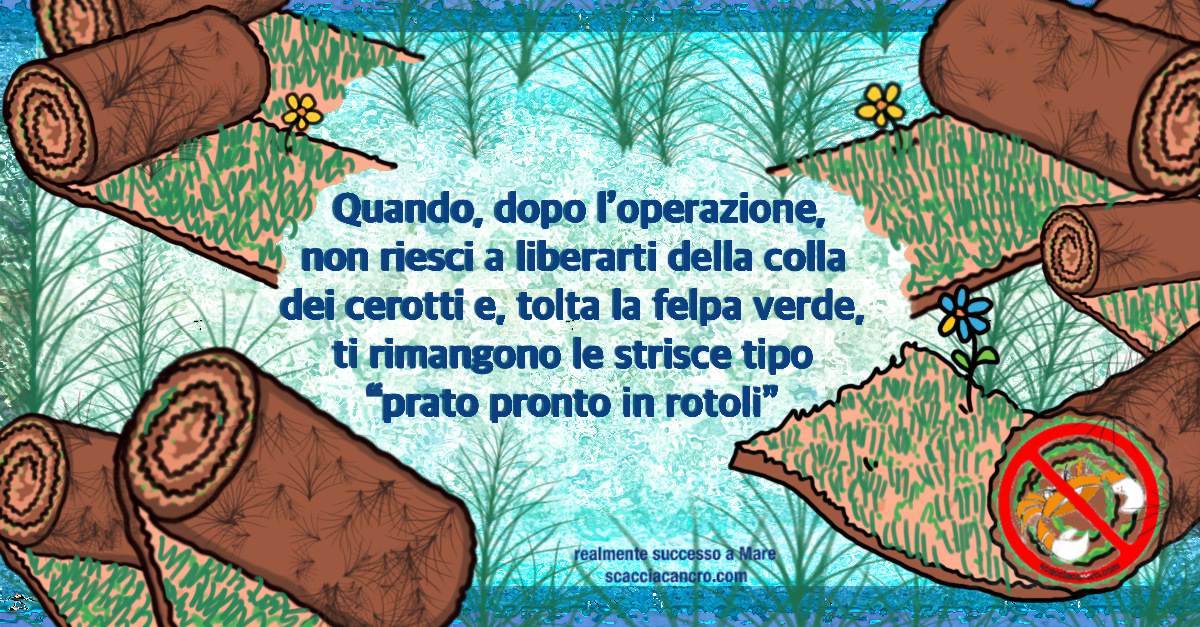 Quando, dopo l’operazione, non riesci a liberarti della colla dei cerotti e, tolta la felpa verde, ti rimangono le strisce tipo “prato pronto in rotoli”.