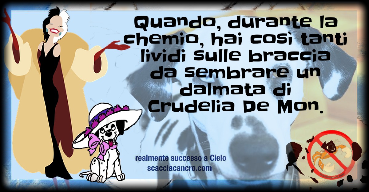 Quando, durante la chemio, hai così tanti lividi sulle braccia da sembrare un dalmata di Crudelia De Mon.