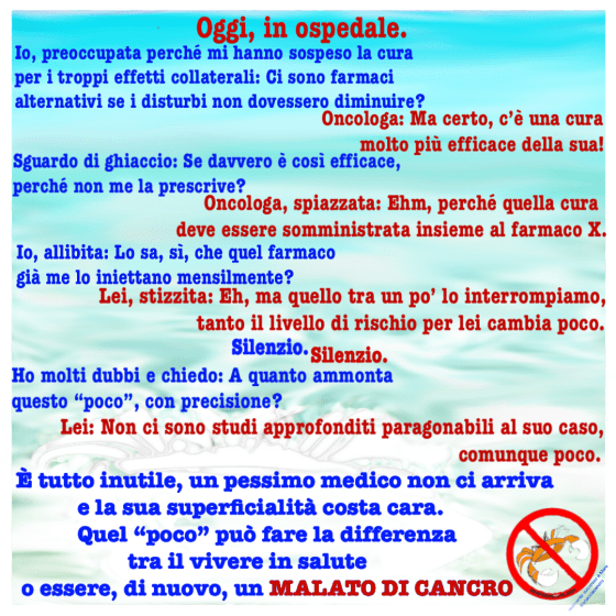 Oggi, in ospedale. Io, preoccupata perché mi hanno sospeso la cura per i troppi effetti collaterali: Ci sono farmaci alternativi … Altro