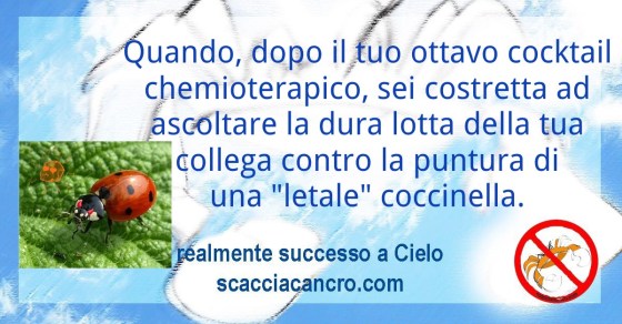 Quando, dopo il tuo ottavo cocktail chemioterapico, sei costretta ad ascoltare la dura lotta della tua collega contro la puntura di una “letale” coccinella.