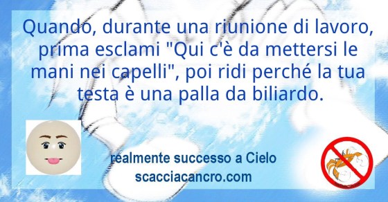 Quando, durante una riunione di lavoro, prima esclami “Qui c’è da mettersi le mani nei capelli”, poi ridi perché la tua testa è una palla da biliardo.