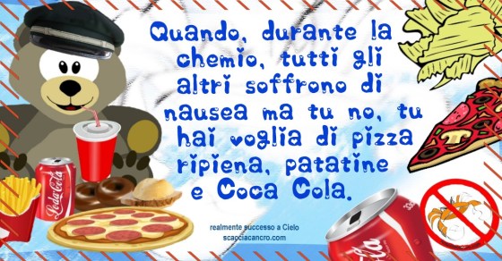 Quando, durante la chemio, tutti gli altri soffrono di nausea ma tu no, tu hai voglia di pizza ripiena, patatine e Coca Cola.