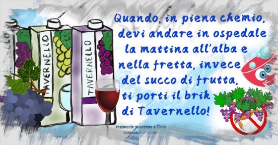 Quando, in piena chemio, devi andare in ospedale la mattina all’alba e nella fretta, invece del succo di frutta, ti porti il brik di Tavernello!